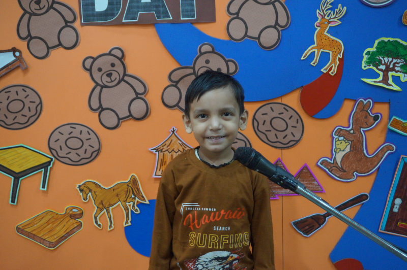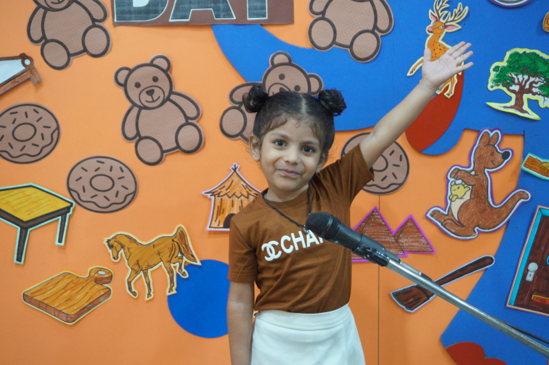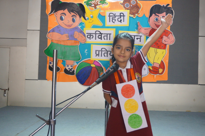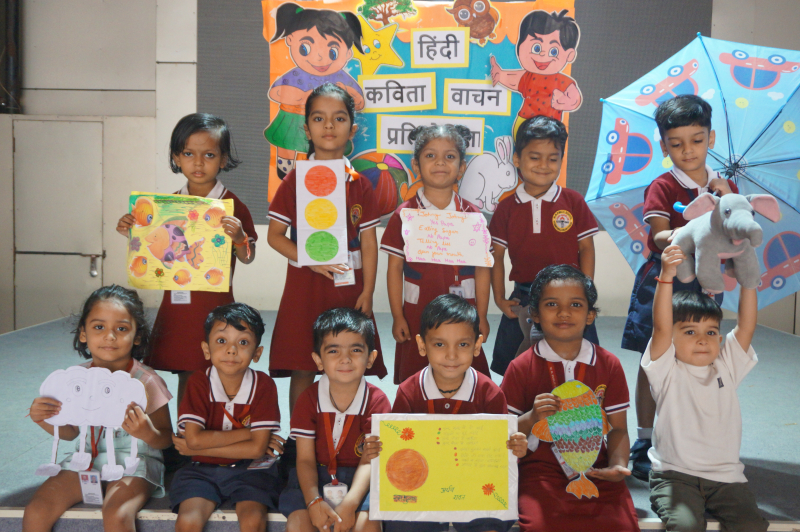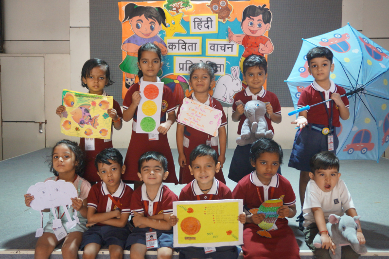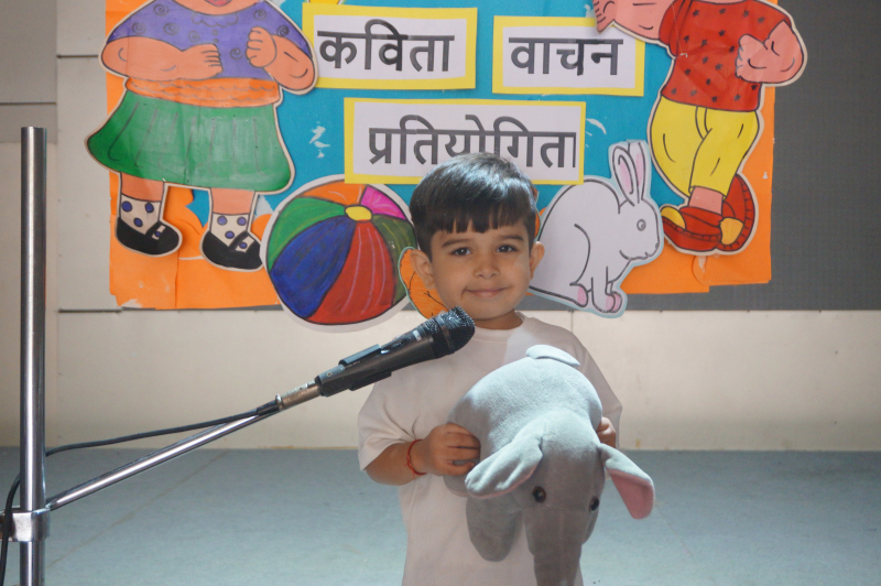 9 अक्टूबर 2025 को एल.के.जी. के छात्रों के लिए आयोजित “हिंदी-कविता वाचन प्रतियोगिता” में बच्चों ने रंगीन और मनमोहक प्रॉप्स के साथ कविताएँ प्रस्तुत कीं। इस अनुभव से उनका आत्मविश्वास बढ़ा, नए शब्दों से उनकी भाषा समृद्ध हुई और मंच पर बोलने का अवसर मिला। खेल-खेल में सीखने की प्रक्रिया ने शिक्षा को आनंदमय बना दिया।