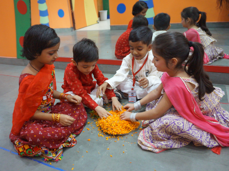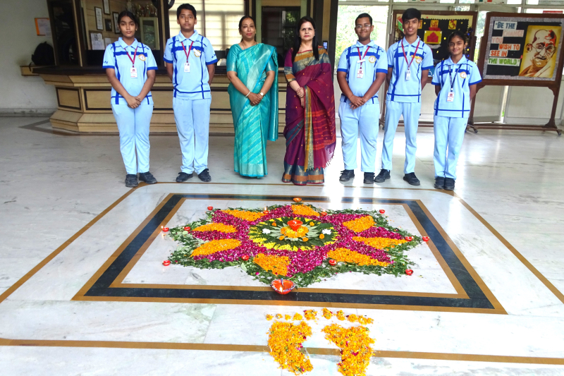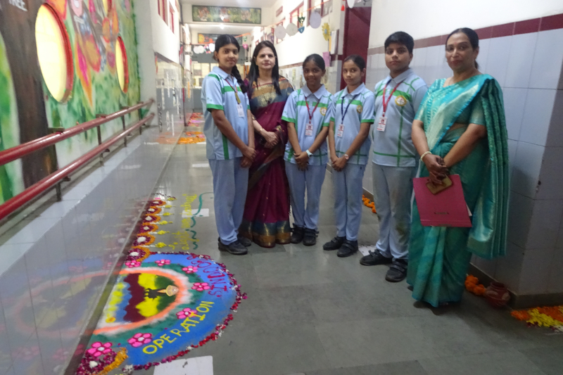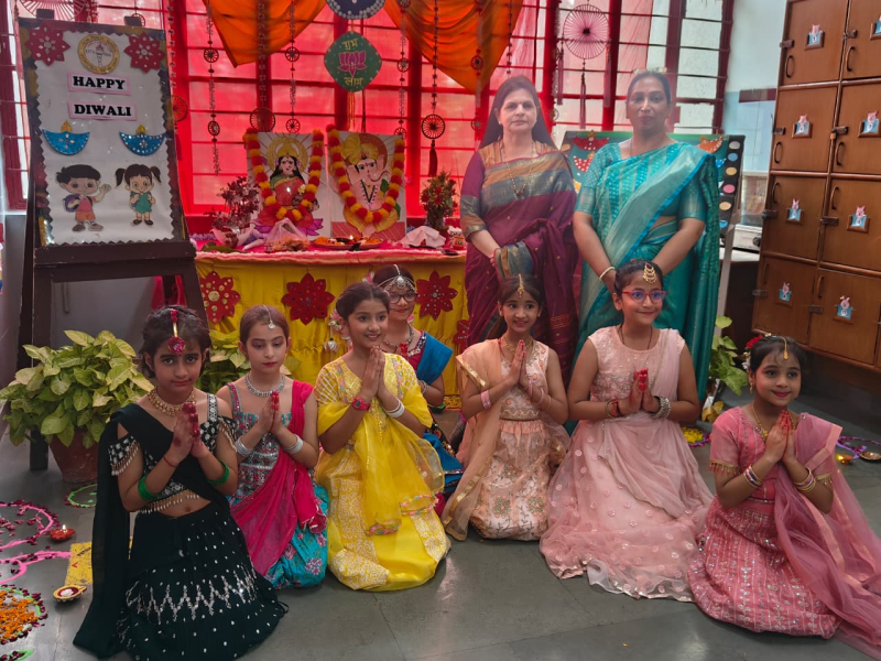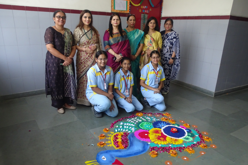 The Pre-Primary Department celebrated Deepawali Utsav with great enthusiasm on 17 October 2025. Students actively participated in festive craft activities—L.K.G. students made diyas, U.K.G. decorated candles, Grade 1 prepared paper candles, and Grade 2 created paper lanterns using glitter sheets. The school corridors were beautifully decorated, and a vibrant flower rangoli was made by students and teachers.